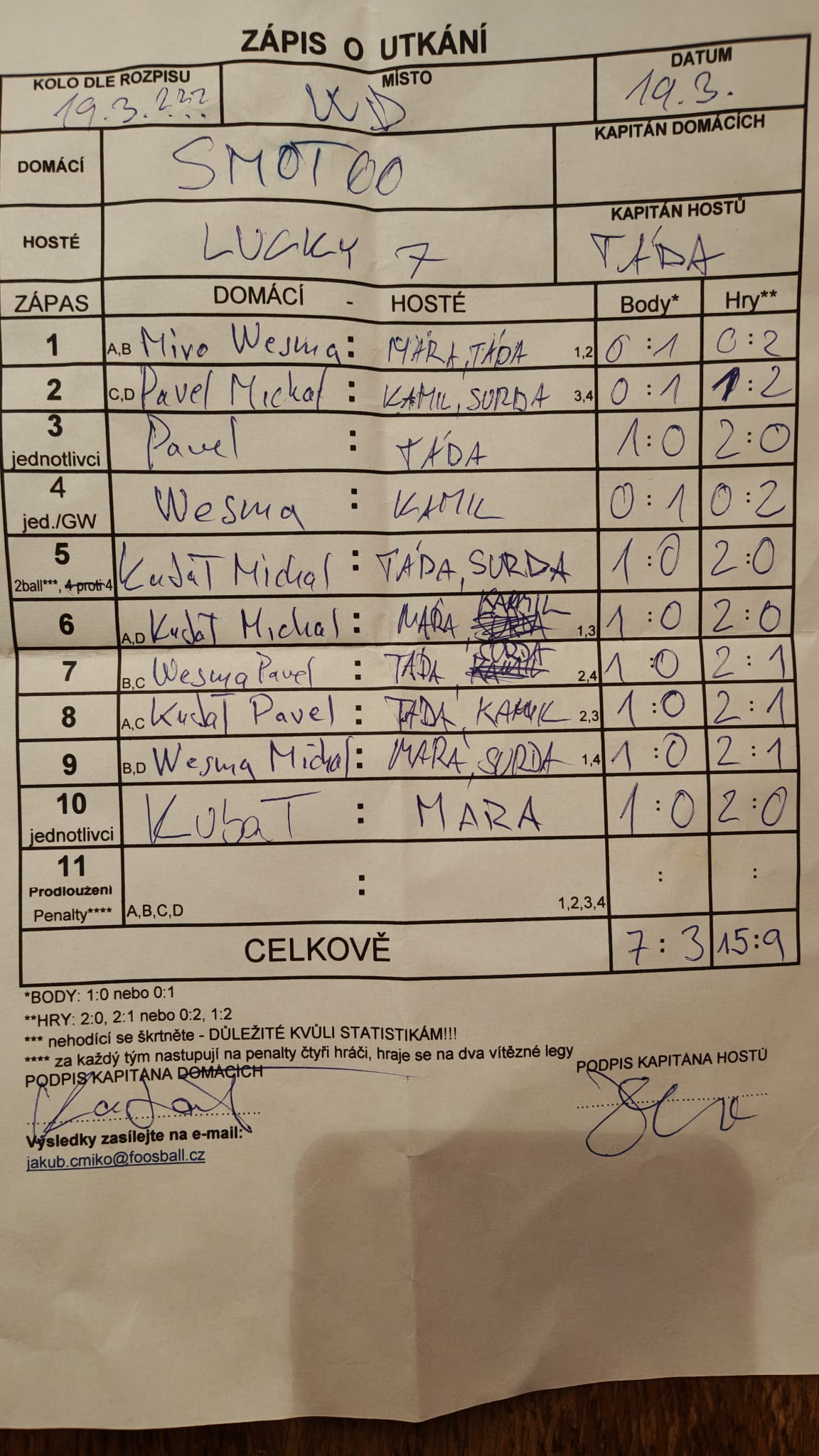 | Kontumace | 0 | 0% |