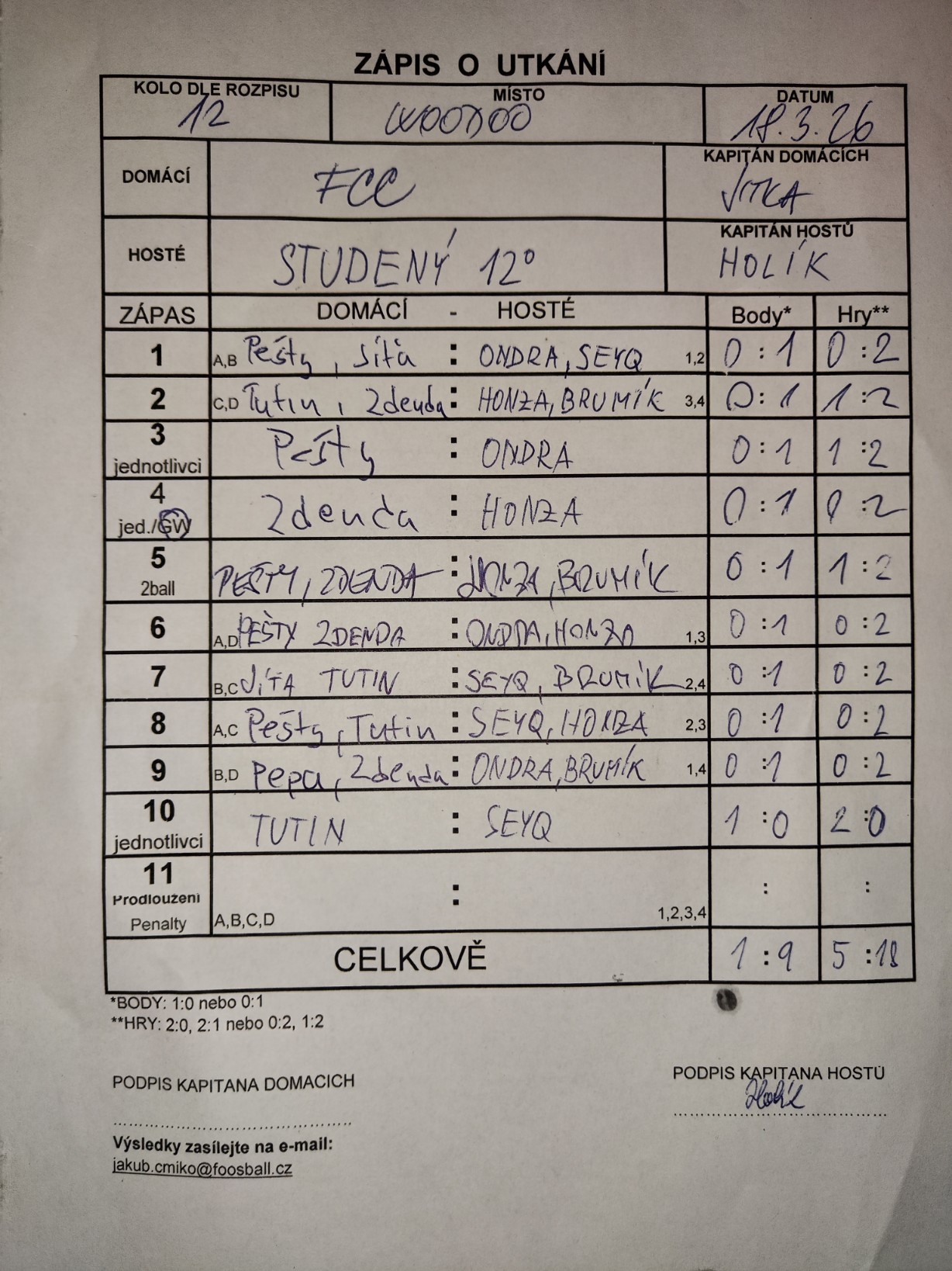 | Celkem zápasů | 18 |